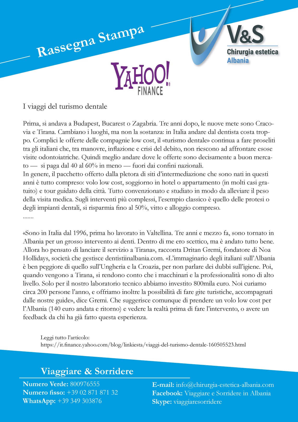 Numeri ed elevati standard di eccellenza che hanno permesso a DENTISTI IN ALBANIA di attirare l’attenzione di TV e GIORNALI italiani: LA GABBIA, IL FATTO QUOTIDIANO, CORRIERE DELLA SERA, SOLE 24 ORE, YAHOO FINANZA, MARCO POLO. Clicca sui loghi delle testate per leggere gli articoli.